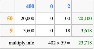 That's all there is to it! As you can see from the box above, the answer to 402 times 59 using the box method is 23,718.