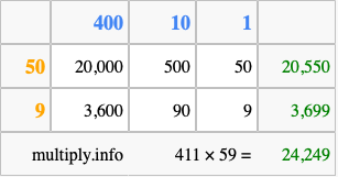 That's all there is to it! As you can see from the box above, the answer to 411 times 59 using the box method is 24,249.