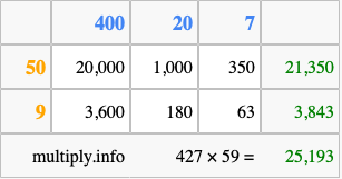 That's all there is to it! As you can see from the box above, the answer to 427 times 59 using the box method is 25,193.