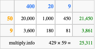 That's all there is to it! As you can see from the box above, the answer to 429 times 59 using the box method is 25,311.