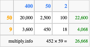 That's all there is to it! As you can see from the box above, the answer to 452 times 59 using the box method is 26,668.
