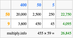 Below is an illustration showing you how to calculate 455 times 59 using the box method, using the instructions above.