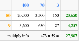 Below is an illustration showing you how to calculate 473 times 59 using the box method, using the instructions above.