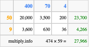 Below is an illustration showing you how to calculate 474 times 59 using the box method, using the instructions above.