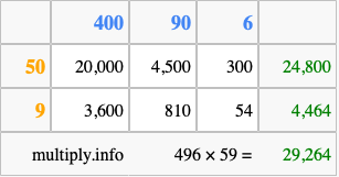 That's all there is to it! As you can see from the box above, the answer to 496 times 59 using the box method is 29,264.