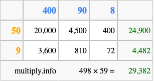 That's all there is to it! As you can see from the box above, the answer to 498 times 59 using the box method is 29,382.