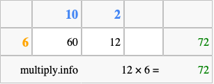 That's all there is to it! As you can see from the box above, the answer to 12 times 6 using the box method is 72.