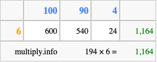 That's all there is to it! As you can see from the box above, the answer to 194 times 6 using the box method is 1,164.