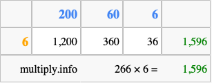 Below is an illustration showing you how to calculate 266 times 6 using the box method, using the instructions above.