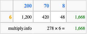 That's all there is to it! As you can see from the box above, the answer to 278 times 6 using the box method is 1,668.
