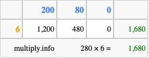 That's all there is to it! As you can see from the box above, the answer to 280 times 6 using the box method is 1,680.