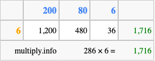 That's all there is to it! As you can see from the box above, the answer to 286 times 6 using the box method is 1,716.
