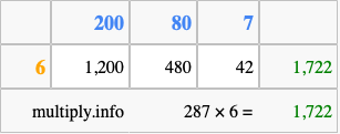 Below is an illustration showing you how to calculate 287 times 6 using the box method, using the instructions above.
