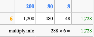That's all there is to it! As you can see from the box above, the answer to 288 times 6 using the box method is 1,728.