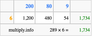 That's all there is to it! As you can see from the box above, the answer to 289 times 6 using the box method is 1,734.