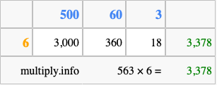 Below is an illustration showing you how to calculate 563 times 6 using the box method, using the instructions above.