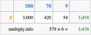 That's all there is to it! As you can see from the box above, the answer to 579 times 6 using the box method is 3,474.