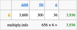Below is an illustration showing you how to calculate 656 times 6 using the box method, using the instructions above.