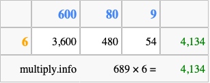 Finally, we add up all the sums we found in step 3 to get our final answer to 689 times 6.