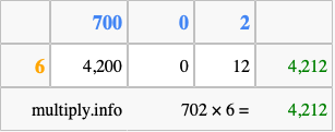 That's all there is to it! As you can see from the box above, the answer to 702 times 6 using the box method is 4,212.