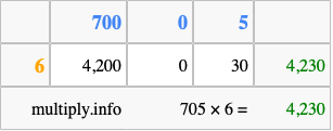 That's all there is to it! As you can see from the box above, the answer to 705 times 6 using the box method is 4,230.