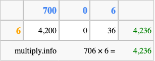 That's all there is to it! As you can see from the box above, the answer to 706 times 6 using the box method is 4,236.