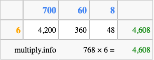 That's all there is to it! As you can see from the box above, the answer to 768 times 6 using the box method is 4,608.