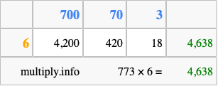 That's all there is to it! As you can see from the box above, the answer to 773 times 6 using the box method is 4,638.