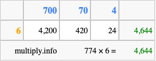 Below is an illustration showing you how to calculate 774 times 6 using the box method, using the instructions above.