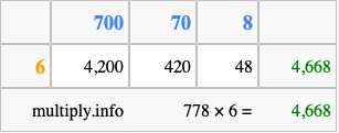 That's all there is to it! As you can see from the box above, the answer to 778 times 6 using the box method is 4,668.