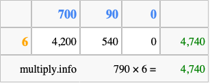 Below is an illustration showing you how to calculate 790 times 6 using the box method, using the instructions above.