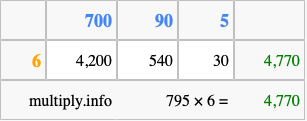 Below is an illustration showing you how to calculate 795 times 6 using the box method, using the instructions above.