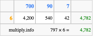 That's all there is to it! As you can see from the box above, the answer to 797 times 6 using the box method is 4,782.