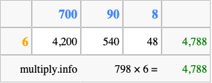 Below is an illustration showing you how to calculate 798 times 6 using the box method, using the instructions above.