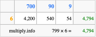 That's all there is to it! As you can see from the box above, the answer to 799 times 6 using the box method is 4,794.