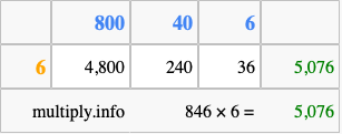 Below is an illustration showing you how to calculate 846 times 6 using the box method, using the instructions above.