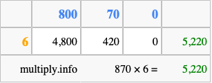 Below is an illustration showing you how to calculate 870 times 6 using the box method, using the instructions above.