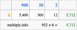 Below is an illustration showing you how to calculate 952 times 6 using the box method, using the instructions above.