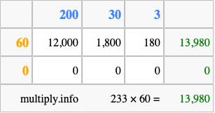 Below is an illustration showing you how to calculate 233 times 60 using the box method, using the instructions above.