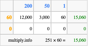 Below is an illustration showing you how to calculate 251 times 60 using the box method, using the instructions above.