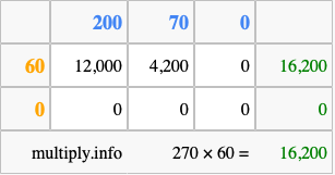 That's all there is to it! As you can see from the box above, the answer to 270 times 60 using the box method is 16,200.