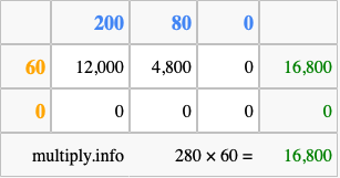 That's all there is to it! As you can see from the box above, the answer to 280 times 60 using the box method is 16,800.