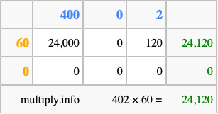 That's all there is to it! As you can see from the box above, the answer to 402 times 60 using the box method is 24,120.