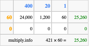 Below is an illustration showing you how to calculate 421 times 60 using the box method, using the instructions above.