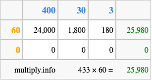 That's all there is to it! As you can see from the box above, the answer to 433 times 60 using the box method is 25,980.