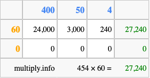 Below is an illustration showing you how to calculate 454 times 60 using the box method, using the instructions above.