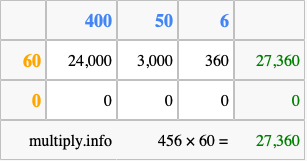 Below is an illustration showing you how to calculate 456 times 60 using the box method, using the instructions above.