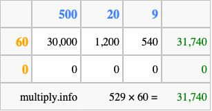 Below is an illustration showing you how to calculate 529 times 60 using the box method, using the instructions above.