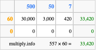 Below is an illustration showing you how to calculate 557 times 60 using the box method, using the instructions above.