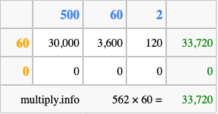 That's all there is to it! As you can see from the box above, the answer to 562 times 60 using the box method is 33,720.